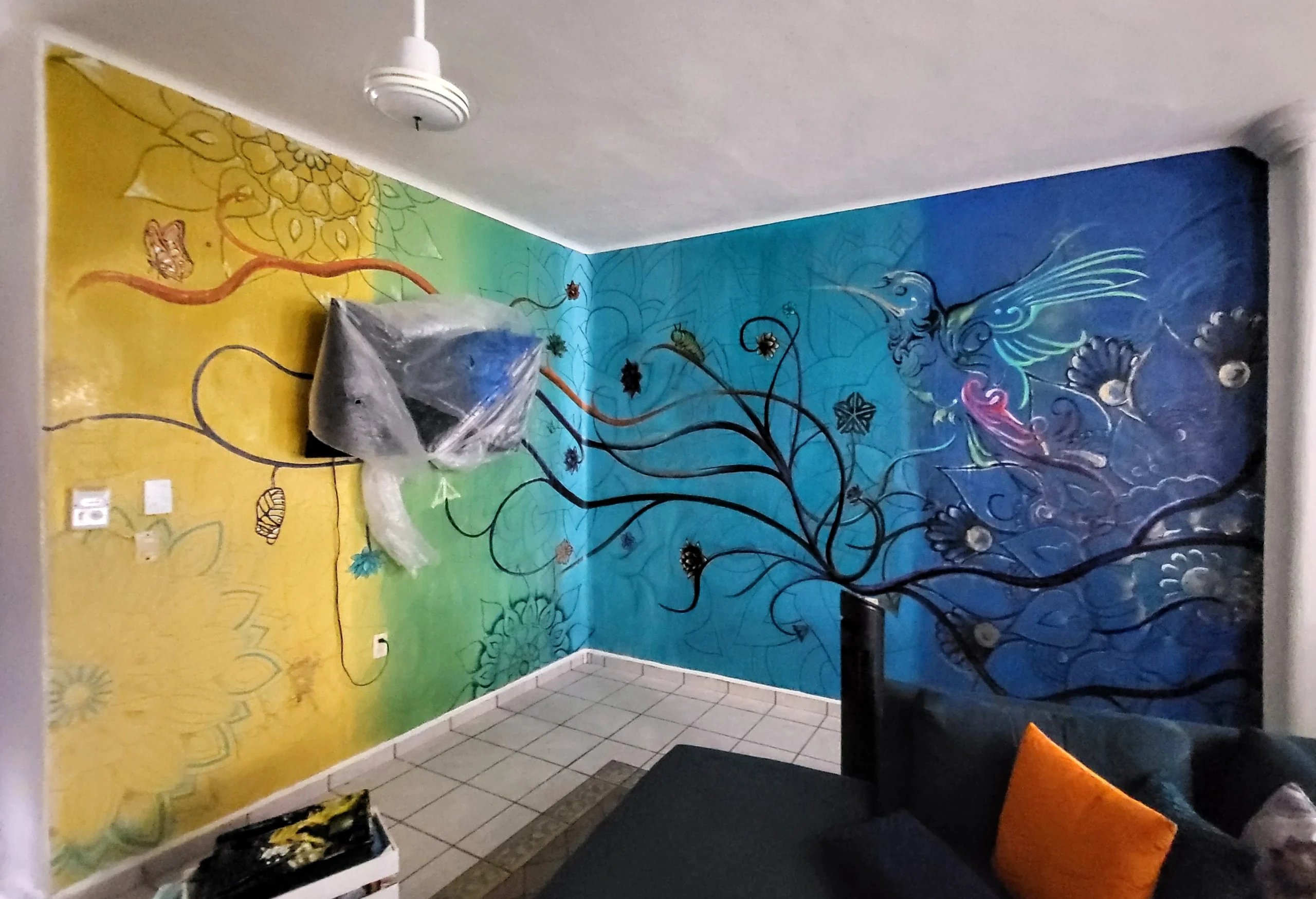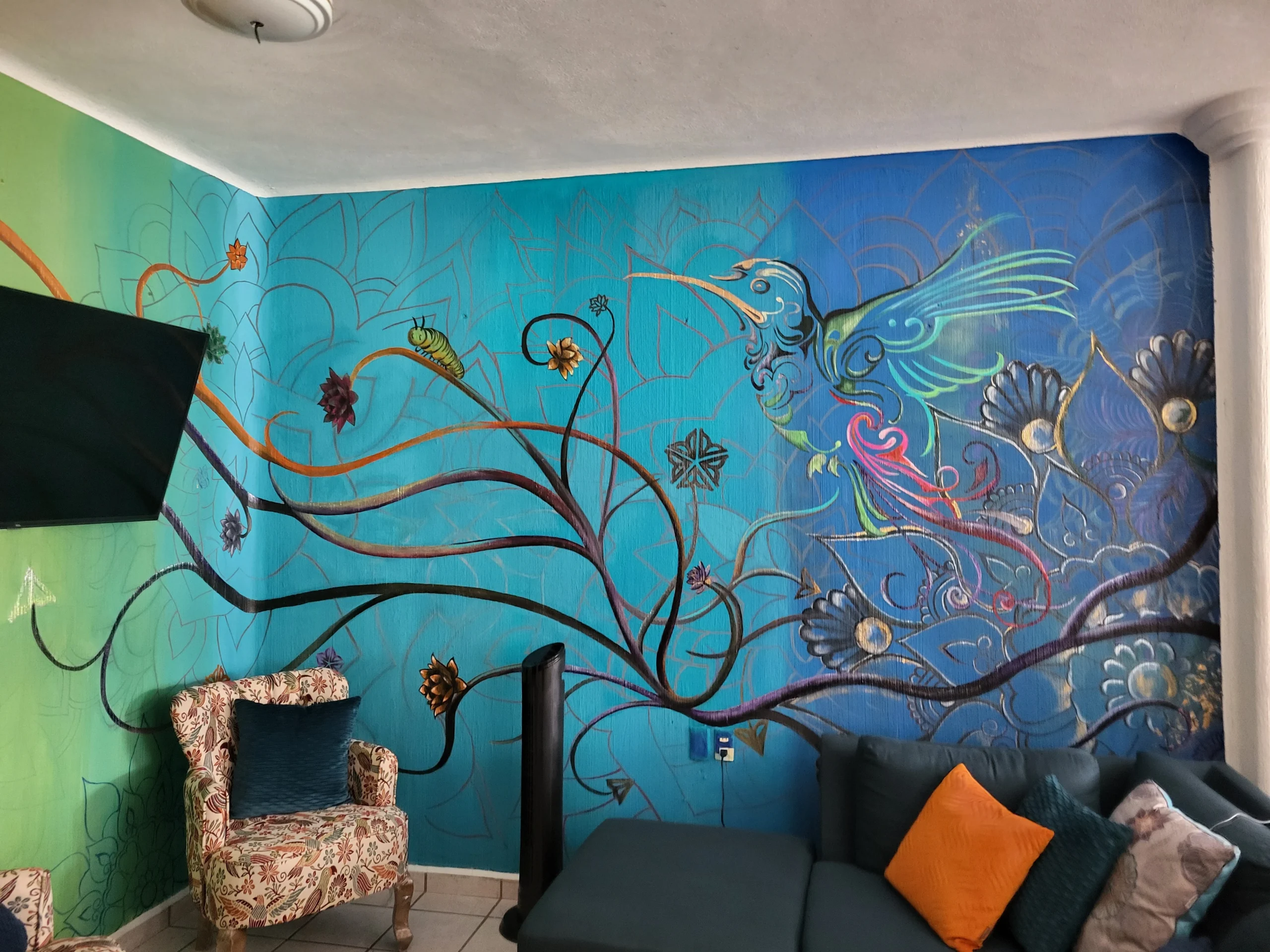 A residential 2 wall project in Puerto Vallarta, Mexico to capture the spirit of the humming bird and meaningful symbols for the client.