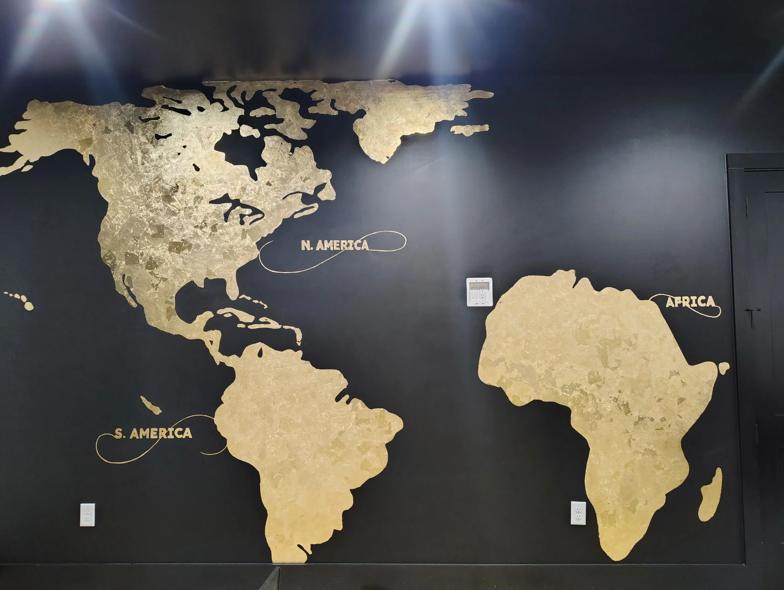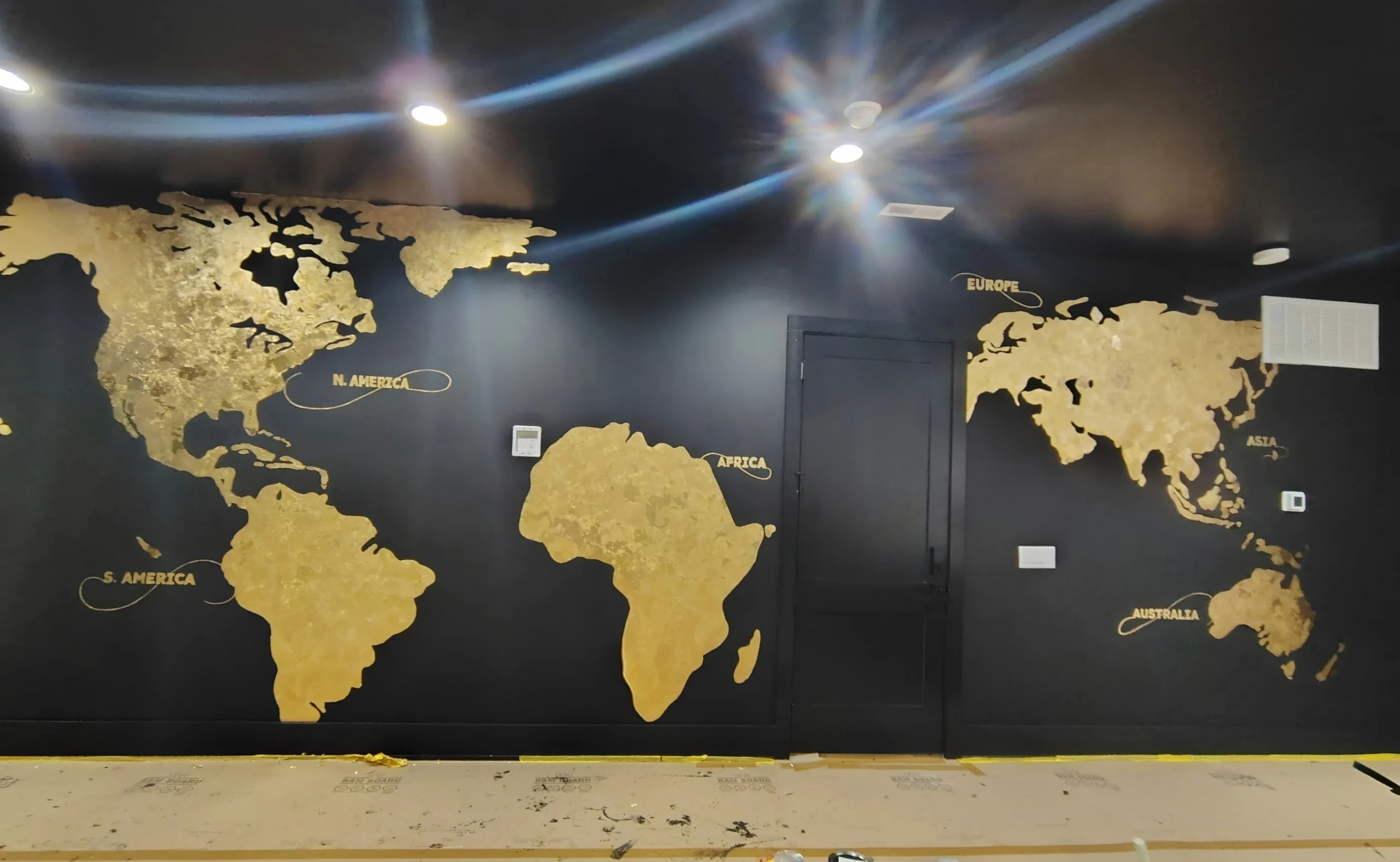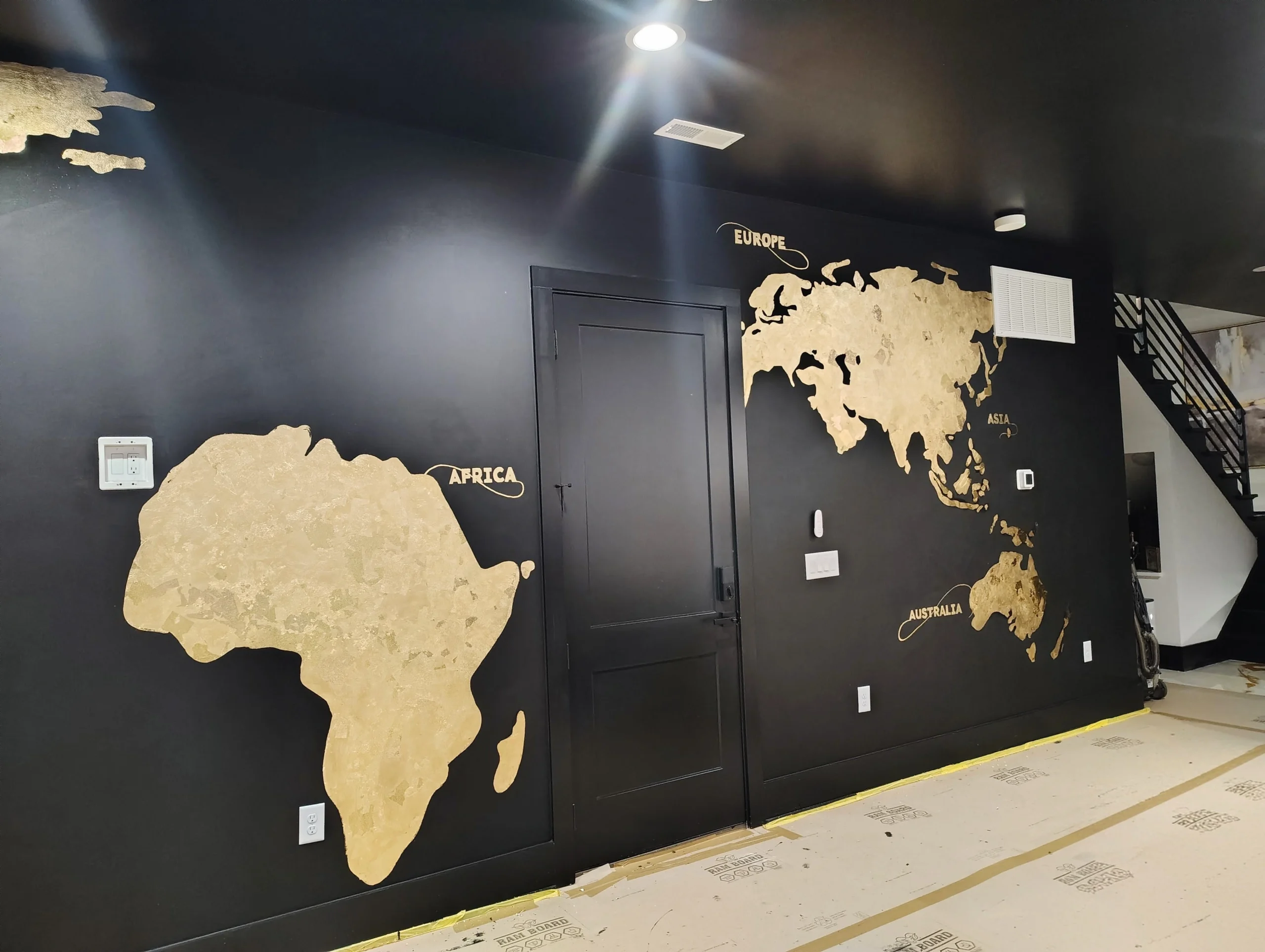 The World Travelers Mural features a bold world map with gold-accented continents on a deep black wall, giving it a rich, dimensional feel. It’s meant to spark conversation and reflect a love for travel, culture, and connection, while serving as a strong focal point for the room.