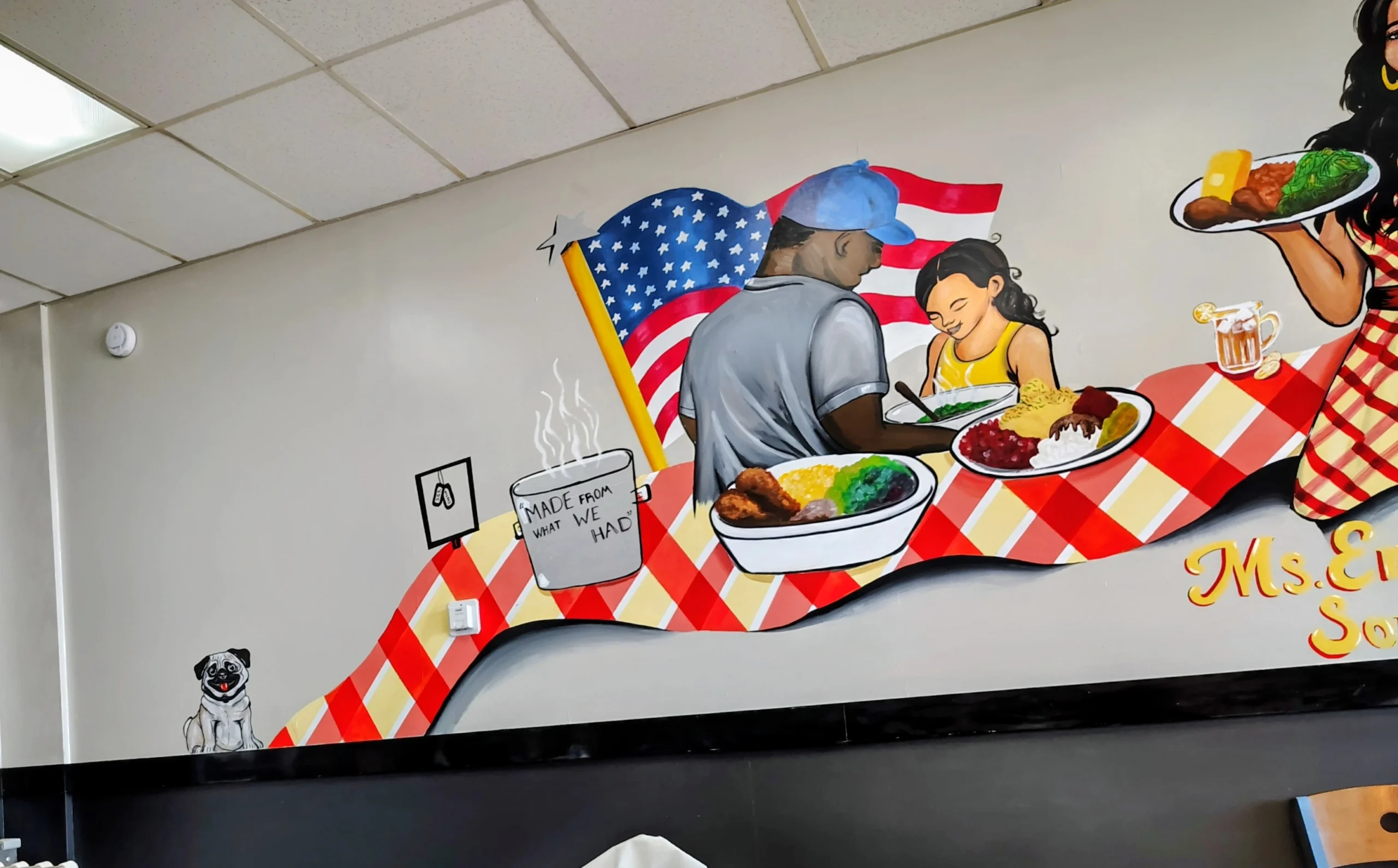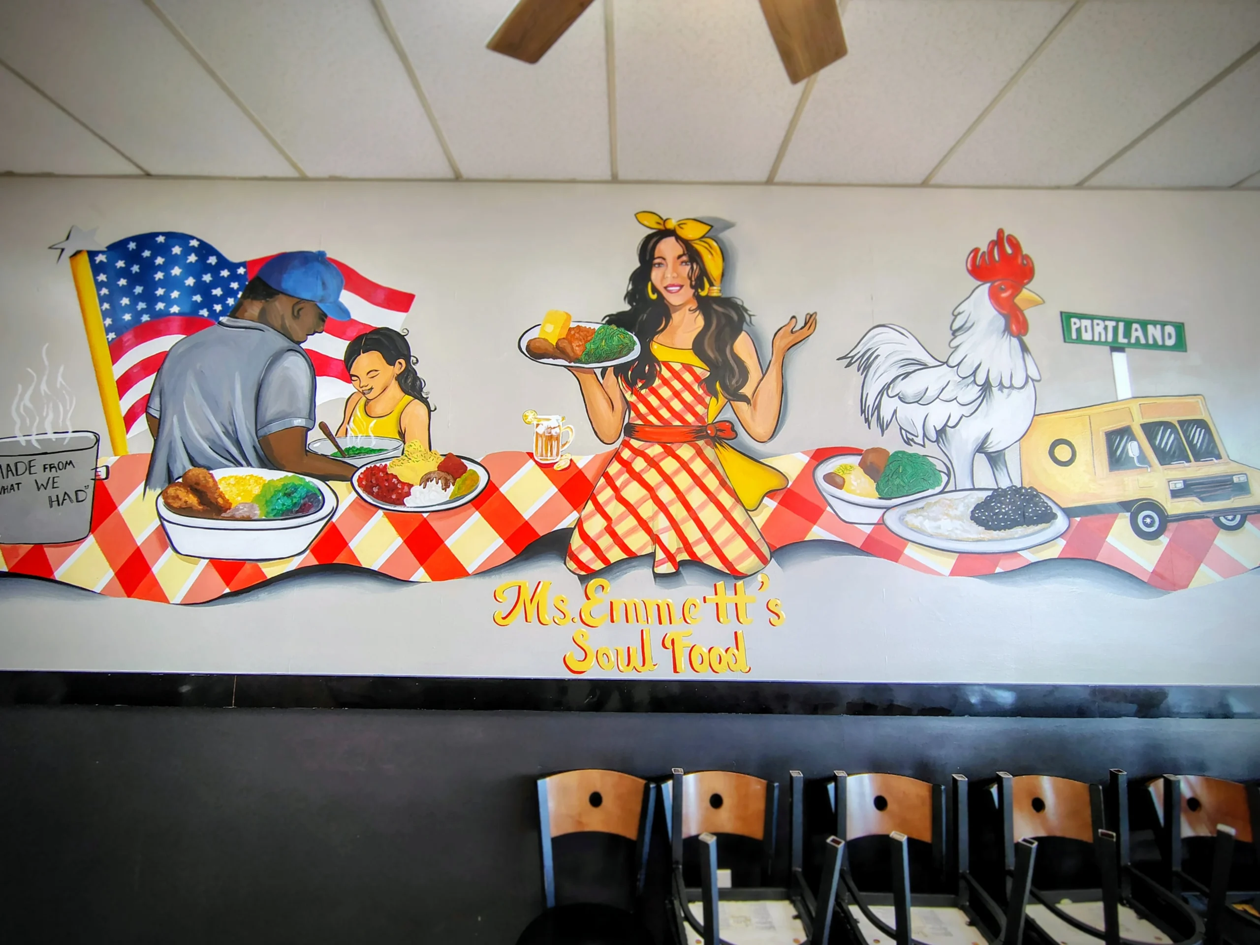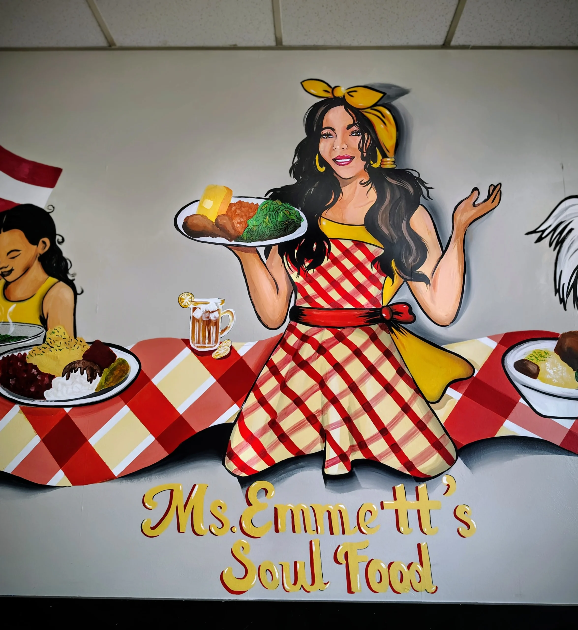 The Legacy Wall Mural was created for Ms. Emmitt’s Soul Food Restaurant as both a mural and a storytelling piece. The design highlights her journey, from her Portland roots, to selling her food truck to Jelly Roll, to rebuilding her brand in Gallatin, TN. Every element was placed with intention to reflect growth, resilience, and legacy, while also creating a warm, welcoming backdrop that customers can connect with and enjoy.